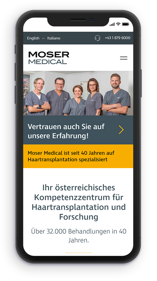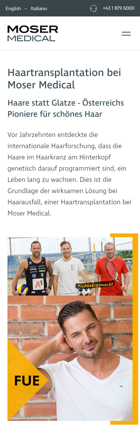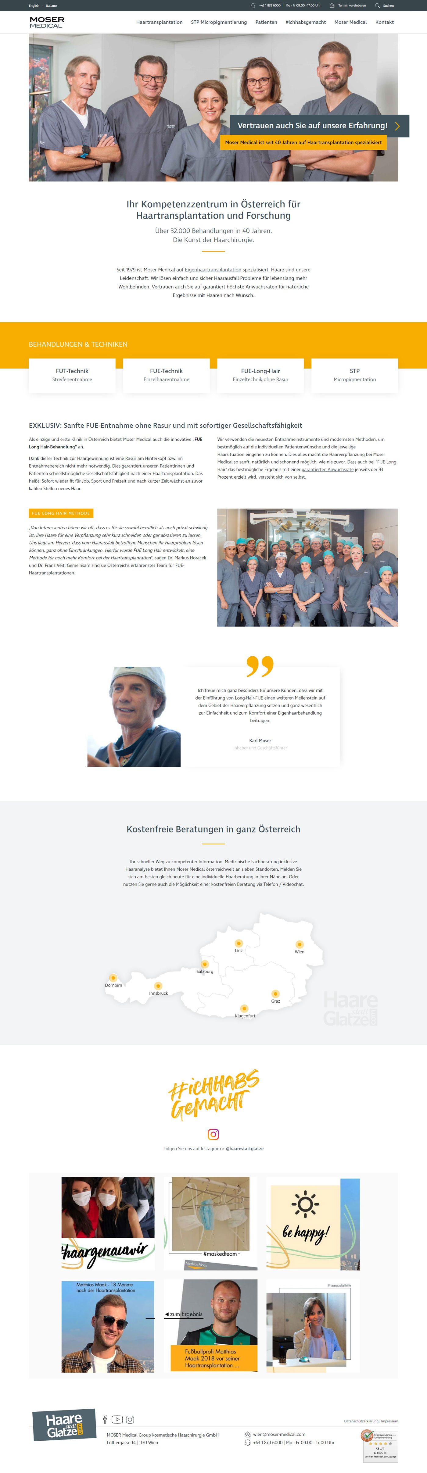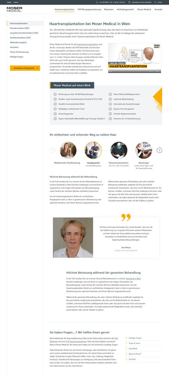Moser Medical ist führender Experte für Eigenhaartransplantation und verhilft als solcher unzähligen Patienten zu einem jüngeren, vitaleren Aussehen. Diese umfassende Kompetenz und langjährige Erfahrung transportiert auch die Webseite des Instituts, die neben einer einfühlsamen und transparenten Patient*inneninformation auch besonders auf den Aufbau von Vertrauen setzt. Stete, aber unaufdringliche Platzierungen von Call To Action-Buttons unterstreichen den intensiven Beratungsansatz von Moser Medical und führen User zielsicher zu ihrem passenden Ansprechpartner.