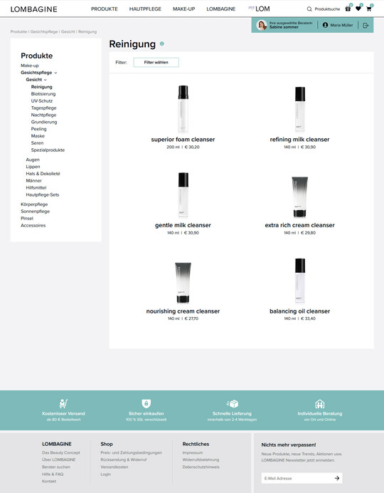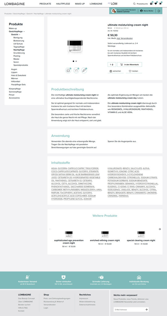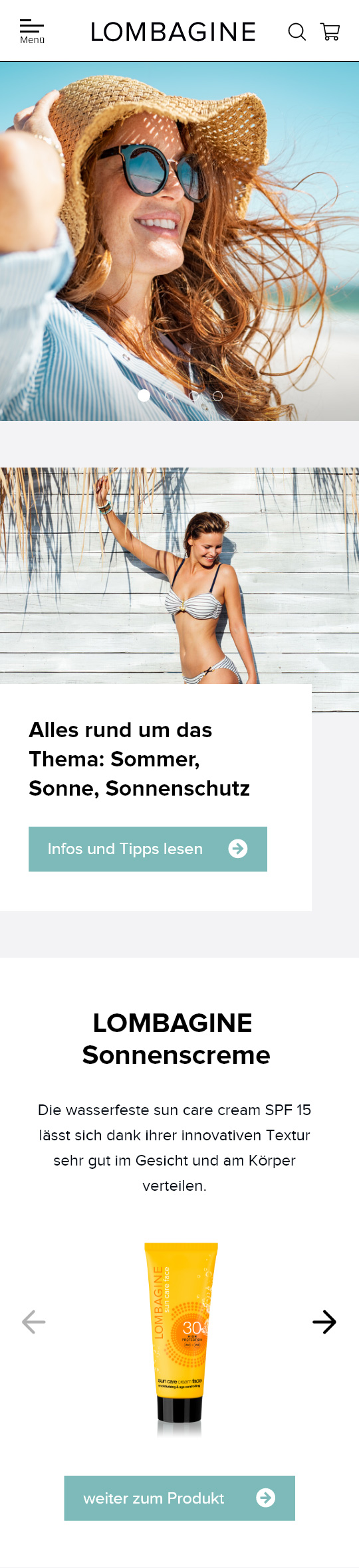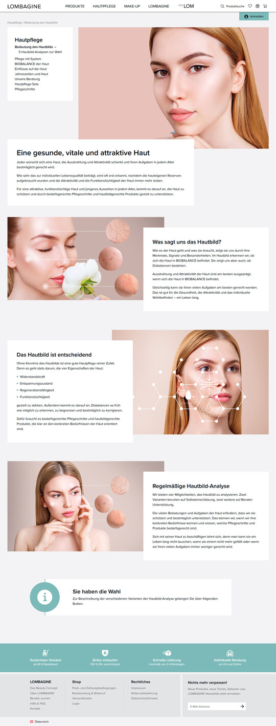 LOMBAGINE setzt auf hohe Wirksamkeit und Sicherheit der kosmetischen Produkte durch qualitative Beratung. Um auch den Beratungsansatz online darzustellen, wurde für die Webseite von LOMBAGINE eine Kombination aus Neos und Shopware gewählt: Das CMS Neos bindet den Berater unterstützend für den Endkunden in die Webseite ein und präsentiert die Produkte sauber und modern. Shopware sorgt dank direkter Anbindung an die Warenwirtschaft für einen unkomplizierten Online-Einkauf.